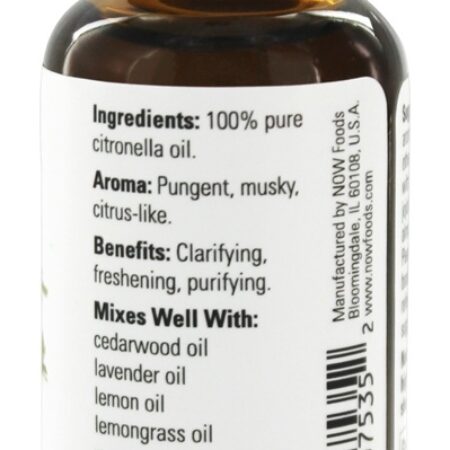 NOW Foods O óleo de citronela é 100 % puro e natural, e destilado a vapor a partir de grama fresca e seca de citronela. NOW Foods O óleo de citronela tem um aroma inconfundivelmente forte que sugere citrinos e é uma reminiscência das noites de verão no pátio. Apesar de ser mais comumente conhecido como um impedimento natural para insetos, também pode ser encontrado em muitos sabonetes, shampoos e loções.