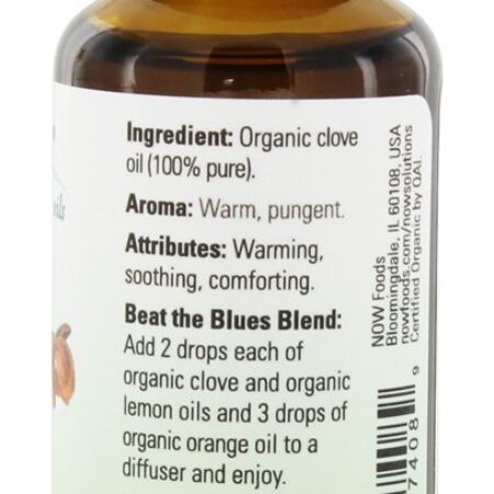 NOW Foods O óleo essencial orgânico de cravo contém cravinho orgânico certificado e 100 % puro. NOW Foods O óleo essencial orgânico de cravo tem um aroma quente e pungente. NOW Foods O óleo essencial orgânico de cravo tem atributos de aquecimento, calmantes e reconfortantes.