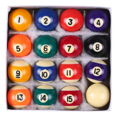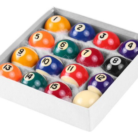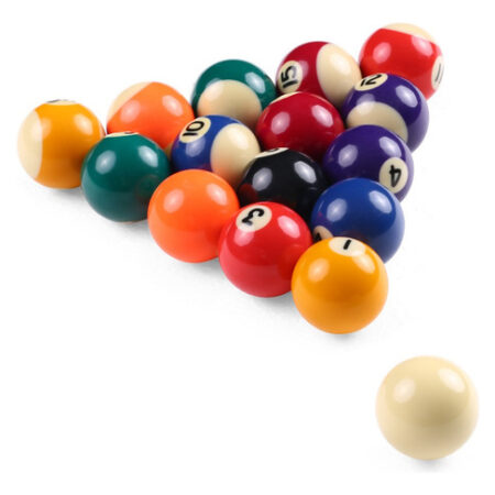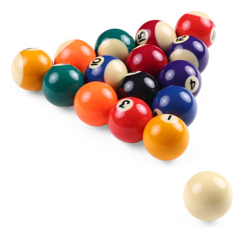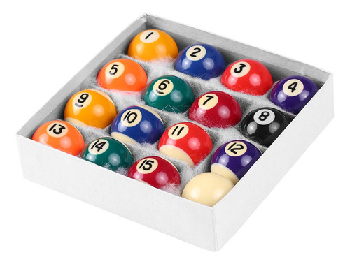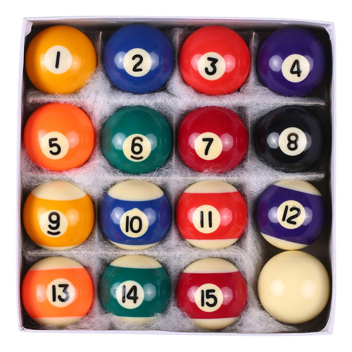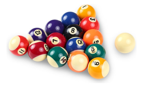 Conjunto inclui: 7 bolas listradas, 7 bolas de cor sólida, 1 bola oito preta e 1 bola branca.