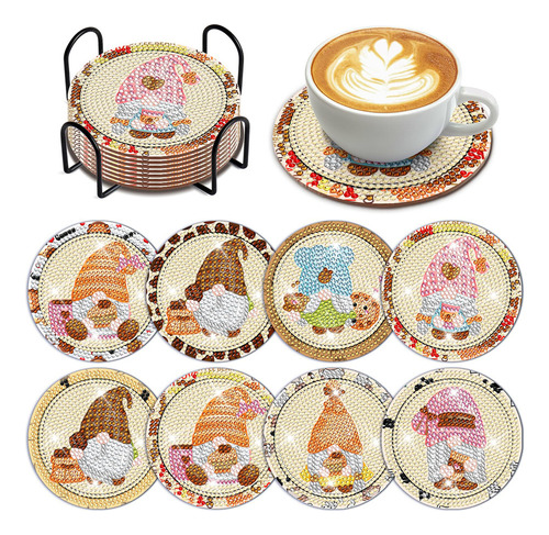 8 peças de kit de montanha-russa de pintura de diamante Pumpkin Gnome Pintura de diamante acrílico DIY Coaster Red Candy com suporte Diamond Painting Crafts Coaster Coffee Bean Gnome para adultos e crianças Suprimentos de presente para iniciantes