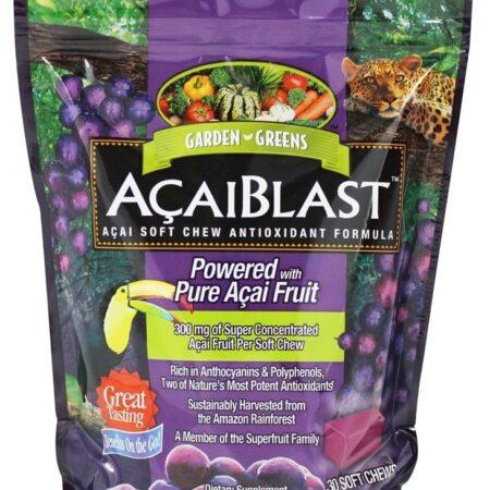 Agora você pode aproveitar os benefícios da fruta Açaí rica em antioxidantes em uma deliciosa e suave mastigação. Garden Greens AcaiBlast … seu padrão ouro para suplementos alimentares concentrados.