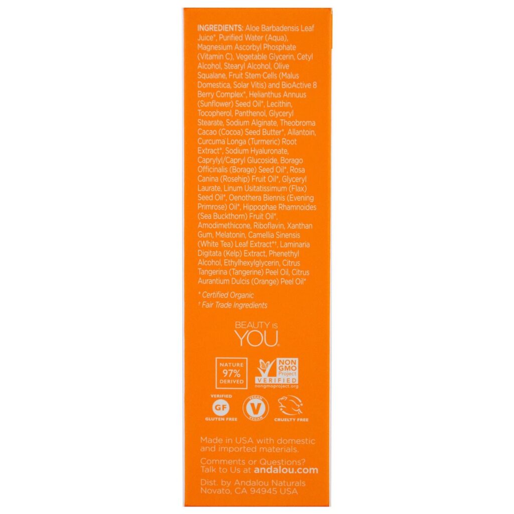 A Andalou Naturals utiliza formas estabilizadas de Vitamina C em suas formulações, visando otimizar a eficácia e a tolerância. A concentração específica não é divulgada publicamente, mas a sinergia com outros ativos e a tecnologia Fruit Stem Cells potencializam seus efeitos iluminadores e antioxidantes.