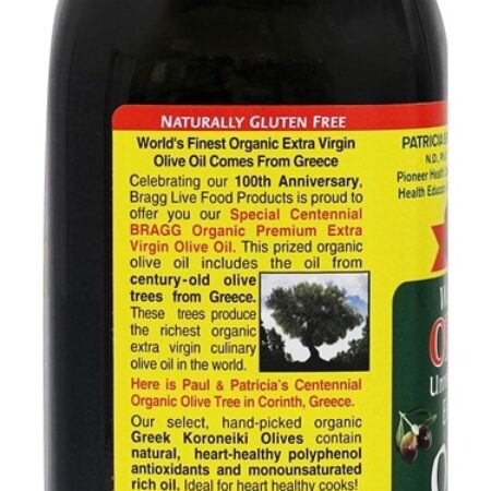 Bragg Azeite de Oliva Extra Virgem Orgânico é feito de 100 % de Azeitonas Gregas produzidas organicamente que continuamente fornecem a melhor qualidade e sabor. Bragg O azeite de oliva extra virgem orgânico tem um corpo delicioso e macio, com um leve sabor residual. Acrescenta o melhor sabor e aroma a saladas, legumes, massas, pestos, molhos, sautés, batatas e a maioria dos alimentos – até mesmo pipoca. Em 400 aC Hipócrates, o Pai da Medicina, usou e escreveu sobre os grandes benefícios do azeite de oliva. Bragg Azeitonas Gregas Koroneiki orgânicas escolhidas e selecionadas à mão contêm antioxidantes polifenóis naturais e saudáveis para o coração e óleo rico monoinsaturado.