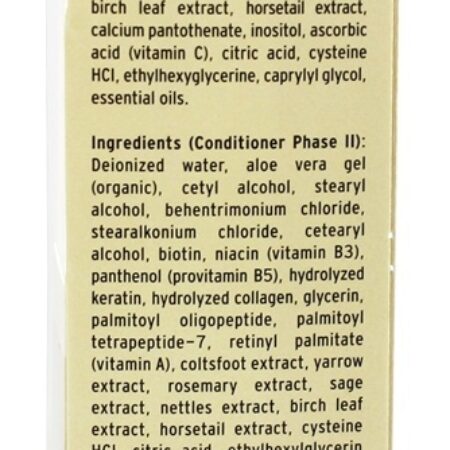 Deionizada água, Aloés Vera Gel*, Cetílico álcool, Stearyl álcool, Behentrimonium Cloreto, Stearalkonium Cloreto, Cetearyl álcool, Biotina, Niacina (Vitamina B3), Pantenol (Provitamina B5), Hidrolisado Ceratina, Hidrolisado Colágeno, Glicerina, Palmitoyl Oligopeptide, Palmitoyl Tetrapeptídeo-7, Retinyl Palmitato (Vitamina Um), Coltsfoot Extrair, Milefólio Extrair, Alecrim Extrair, Sábio Extrair, Urtigas Extrair, Bétula Folha Extrair, Rabo de cavalo Extarct, Cisteína Hcl, Cítrico ácido, Ethylhexylglycerin Caprylyl Glicol, Caramelo, Annatto, Essencial óleos. ph Equilibrado.