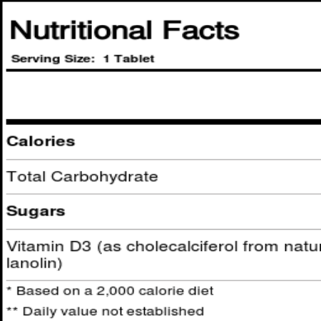 Cada tablete mastigável de Bluebonnet Nutrition Vitamina D3 contém 5.000 UI (Unidades Internacionais) de Vitamina D3.