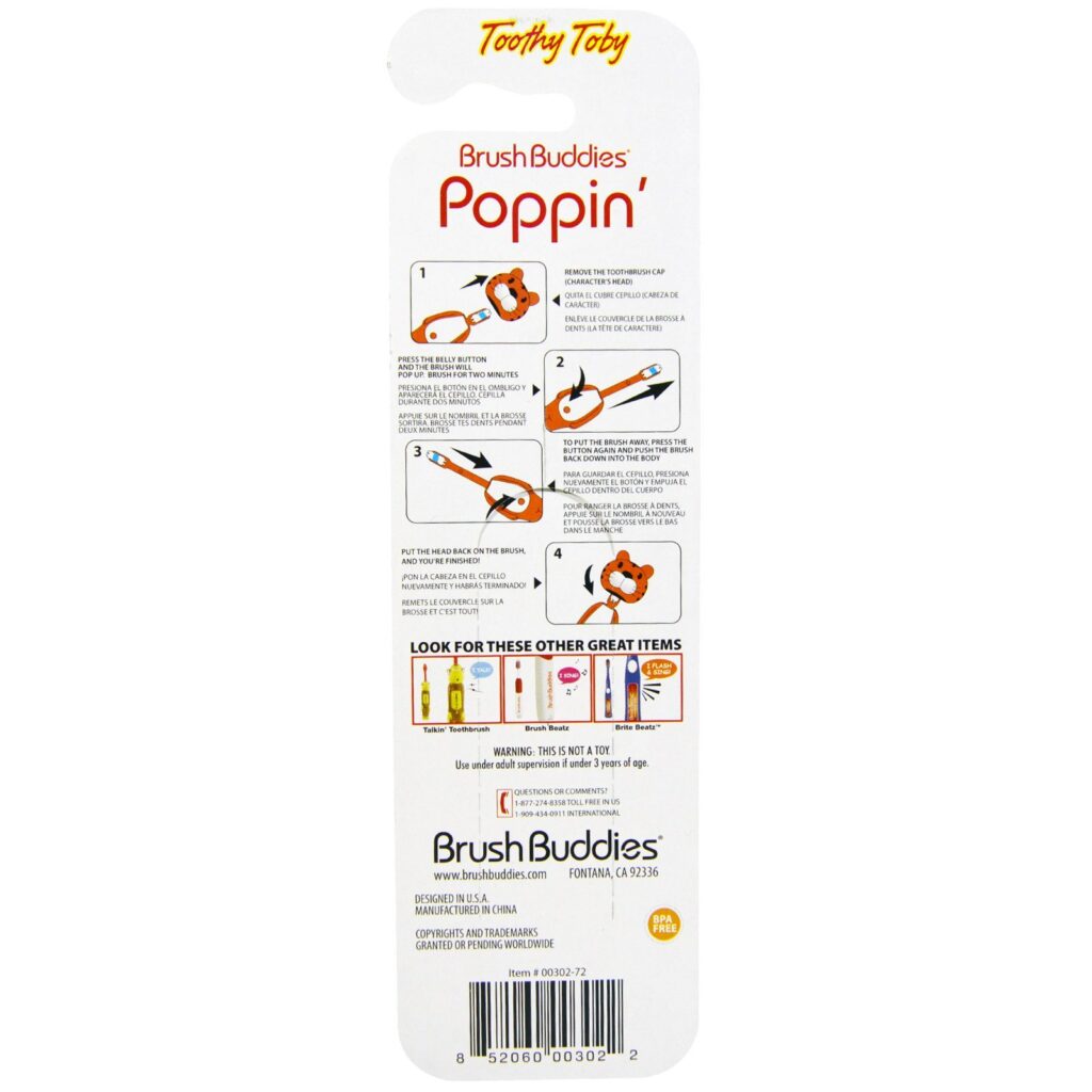 A escova Buddies Poppin torna a escovação divertida! Pressione o umbigo, e a escova sai. Todos os 5 personagens divertidos vêm com cerdas macias, que são suaves para as gengivas das crianças.