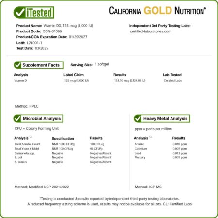 A Vitamina D3 (5.000 UI) da California Gold Nutrition é um suplemento de vitamina D de alta potência e contém colecalciferol de lanolina em cápsulas softgel de gelatina de peixe. Este produto é formulado sem glúten, OGMs ou soja.
