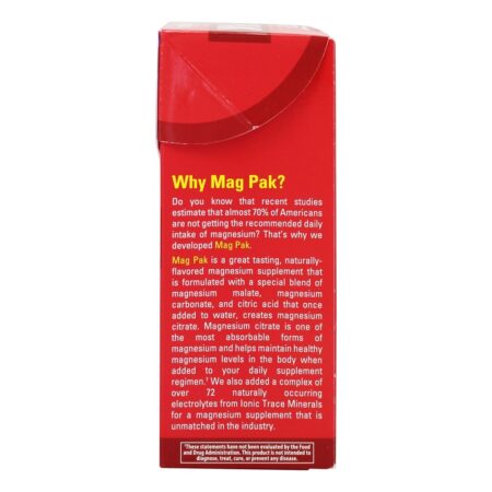 Você sabe que estudos recentes estimam que quase 70 % de americanos não estão recebendo a ingestão diária recomendada de magnésio? É por isso que desenvolvemos o Mag Pak. O Mag Pak é um suplemento de magnésio naturalmente saborizado que é formulado com uma mistura especial de malato de magnésio, carbonato de magnésio e ácido cítrico que uma vez adicionado à água, cria citrato de magnésio. O citrato de magnésio é uma das formas mais absorvíveis de magnésio e ajuda a manter níveis saudáveis de magnésio no corpo quando adicionados ao seu regime de suplemento diário. † Nós também adicionado um complexo de sobre 72 naturalmente ocorrendo eletrólitos de Iônico Traçar Minerais para um magnésio completar que é incomparável em o indústria.