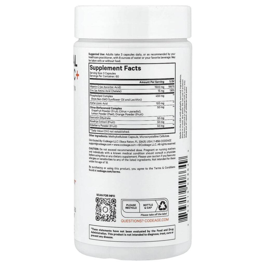 A Vitamina C+ Lipossomal da CodeAge é um suplemento de alta potência. Ela contém 1.500 mg de vitamina C, bioflavonoides cítricos, quercetina, sabugueiro, rosa-mosqueta, zinco e ácido tióctico. Esta fórmula avançada em cápsulas de vitamina C também apresenta um fornecimento lipossomal.