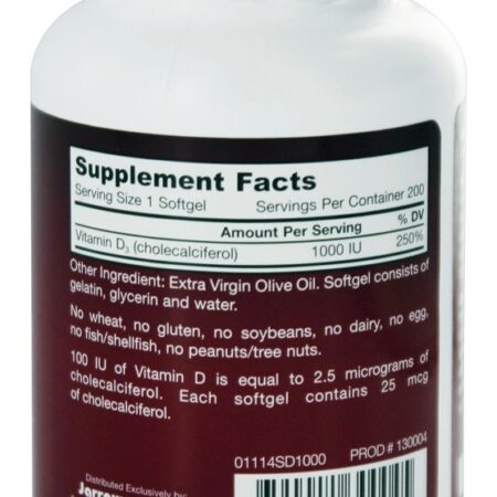 Este Jarrow Formulas Vitamin D3 fornece ao seu corpo uma forma conveniente de satisfazer as suas necessidades nutricionais de quantidades saudáveis de Vitamina D. Este poderoso suplemento fornece ao seu organismo 1,000 UI de vitamina. D3 em cada porção, embalado em uma base de azeite extra-virgem para o máximo de benefícios nutricionais e absorção. Esta fórmula de Cholecalciferol Vitamina D3 apoia o seu corpo com os nutrientes de que necessita para desenvolver e manter ossos e dentes fortes e saudáveis, bem como uma função imunitária e cardiovascular ideal. A vitamina D desempenha um papel essencial no processo de absorção de cálcio e fósforo no intestino delgado, apoiando nutrientes saudáveis no sangue. Além disso, a vitamina D ajuda a bloquear a liberação do hormônio da paratireóide, que pode tornar os ossos fracos e quebradiços. Este suplemento conveniente torna o apoio às suas necessidades nutricionais diárias de vitamina D3 mais fácil do que nunca com cada dose poderosa. Jarrow Formulas usa ingredientes naturais que são livres de muitos alérgenos comuns para criar uma fonte segura de suporte nutricional com várias restrições alimentares. Um softgel é tudo o que você precisa todos os dias para um suporte benéfico ao corpo inteiro.