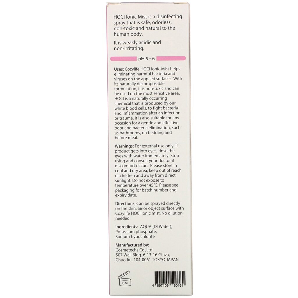 Uses: Cozylife HOCL Ionic Mist helps eliminating harmful bacteria and viruses on the applied surfaces. With is naturally decomposable formulation, it is non-toxic and can be used on the most sensitive area. HOCL is a naturally occurring chemical that is produced by our white blood cells, to fight bacteria and inflammation after an infection or trauma. It is also suitable for any occasion for a gentle and effective odor and bacteria elimination, such as bathrooms, on bedding and before meal.