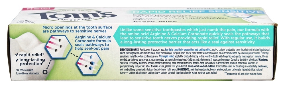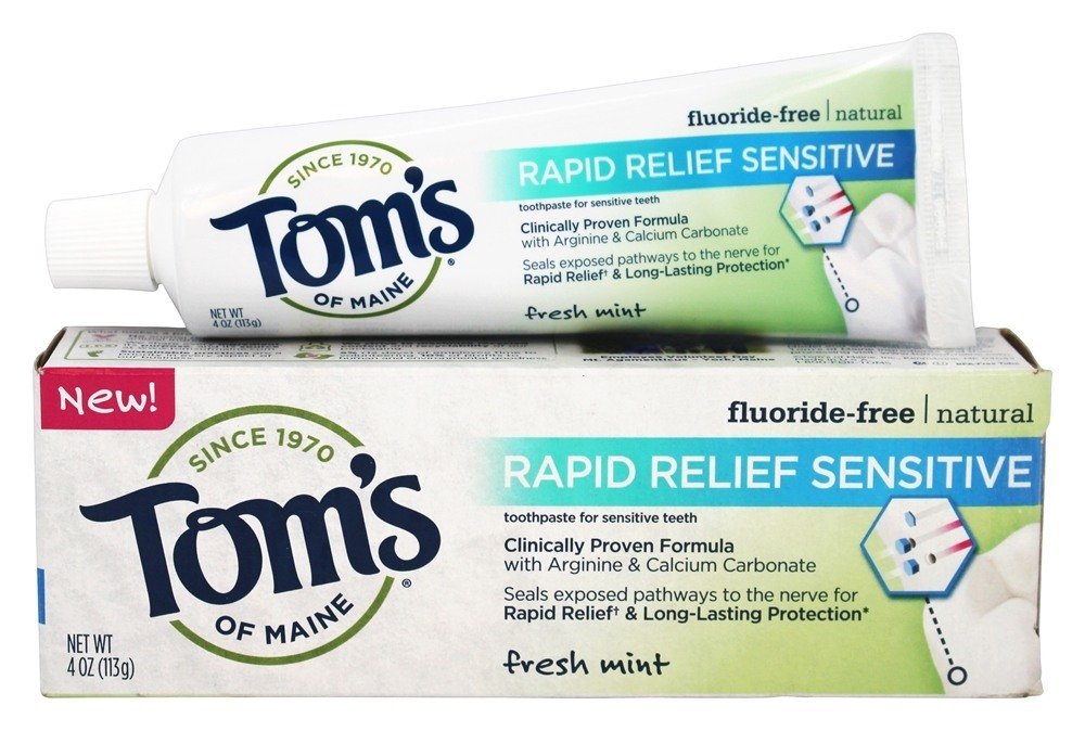 Tom’s of Maine Creme dental livre de flúor livre Creme dental sensível é creme dental para dentes sensíveis. Diferentemente de alguns dentifrícios sensíveis que apenas amortecem a dor, sua fórmula com o aminoácido Arginina e Carbonato de Cálcio sela rapidamente os caminhos que levam a nervos dentais sensíveis, proporcionando alívio rápido. Com o uso regular, ele constrói uma barreira protetora de longa duração que age como um selo contra a sensibilidade.