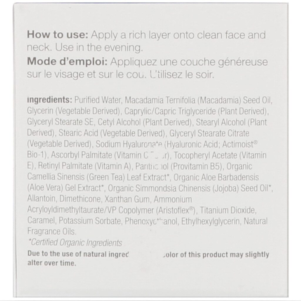 Água purificada, macadâmia ternifolia (macadâmia) óleo de semente, glicerina (derivada de vegetais), triglicérido caprílico / capricê (derivado de plantas), estearato de glicerilo, álcool cetílico (derivado de plantas), álcool estearílico (derivado de plantas), ácido esteárico (derivado de vegetais) , citrato de estearato de glicerilo (derivado de vegetais), hialuronato de sódio (ácido hialurônico, actimoist bio-1), palmitato de ascorrenilo (éster de vitamina c), acetato de tocoferol (vitamina e), palmitato de retinilo (vitamina a), pantenol (provitamin b5), orgânico Extrato de folha de camélia sinensis (chá verde) *, extrato de gel orgânico de aloe barbadensis (aloe vera) *, óleo de semente orgânico simmondsia chinensis (jojoba) *, alantoína, dimeticona, goma xantana, copolímero de acrilidimetiltaurato de amônio / vp (aristoflex), dióxido de titânio, caramelo, sorbato de potássio, fenoxietanol, etilhexilglicerina, óleos de fragrância natural.