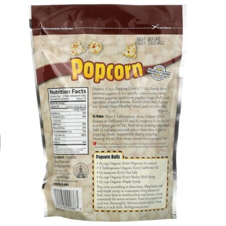 Milho de Pipoca Orgânica da Eden é certificado organicamente cultivado em fazendas de famílias dos EUA. É uma variedade cuidadosamente selecionada, amarela, com qualidades de estalar superiores, produzindo grãos de milho macios e nutritivos. Testado livre de GEO. Uma maneira fácil de adicionar grãos integrais da Heart Healthy à sua dieta.