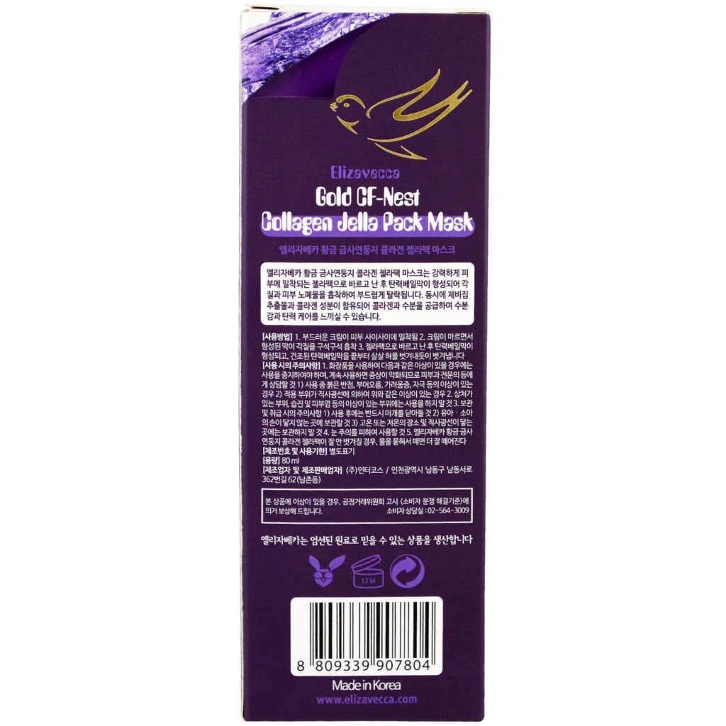 Está repleto dos ingredientes mais luxuosos existentes por aí – extrato de ninho de andorinhão, colágeno, própolis e ouro! Misturada de maneira perfeita, a Máscara Gelatinosa de Ninho, Colágeno e Ouro da Elizavecca hidrata a pele com uma fórmula premium para ajudar a melhorar a elasticidade, enquanto faz sua pele parecer mais reluzente e mais firme. Esta máscara suave também remove células mortas da superfície da pele quando seca, e ao remover você revelará uma pele mais limpa e de aparência mais saudável.
