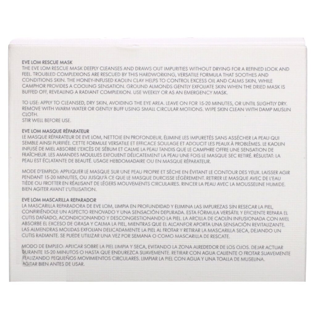 The Eye Lom Rescue Mask deeply cleanses and draws out impurities without drying for a refined look and feel. Troubled complexions are rescued by this hardworking, versatile formula that soothes and conditions skin. The honey-infused kaolin clay helps to control excess oil and calms skin, while camphor provides a cooling sensation. Ground almonds gently exfoliate skin when the dried mask is buffed off, revealing a radiant complexion. Use weekly or as an emergency mask.