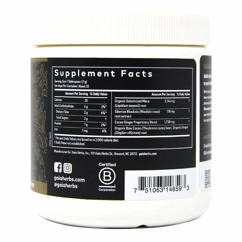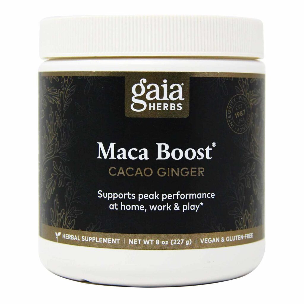 Palavras-chave: Gaia Herbs, Maca Peruana, energia, vitalidade, cacau, gengibre, suplemento.