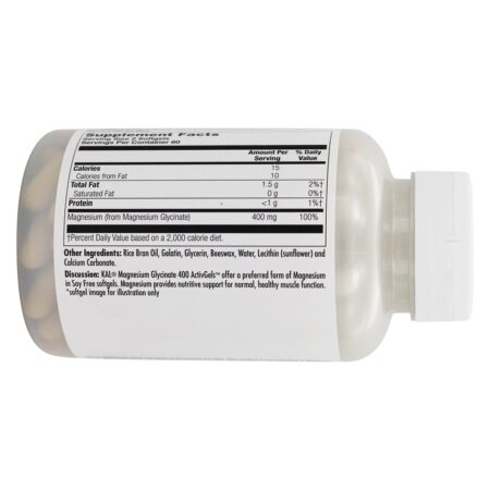 Kal O glicinato de magnésio contém 400 mg de magnésio a partir de glicinato de magnésio. Kal Glicinato de magnésio 400 ActivGels oferecem uma forma preferida de magnésio em cápsula gelatinosas Free de soja. O magnésio fornece suporte nutritivo para a função muscular normal e saudável.