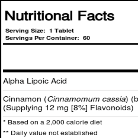 Cada tablete contém 300 mg, sendo 150 mg de Ácido Alfa-Lipóico e 150 mg de Extrato de Canela.
