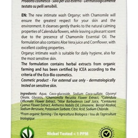 Organyc A Lavagem Íntima com Óleo Essencial de Camomila e Extratos é formulada com agentes tensoativos derivados de matérias-primas orgânicas que deixam a pele protegida e hidratada. A ausência de SLS e SLES, que são potencialmente prejudiciais, torna este produto adequado para a pele mais sensível. Organyc Lavagem íntima com óleo essencial de camomila e extratos garante o maior respeito pela sua pele e pelo meio ambiente. Limpa suavemente graças às propriedades naturais calmantes das flores da Calêndula, deixando um aroma agradável devido à presença do Óleo Essencial de Camomila. O formulação também contém Aloés Vera suco e Centáurea-azul, com excelente resfriamento propriedades. Organyc íntimo Lavar é adequado para diário higiene, também para o a maioria sensível pele.