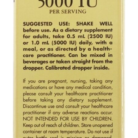 Agitar antes de usar. Como suplemento dietético para adultos, tome 0.5 ml ( 2500 UI) ou 1.0 ml ( 5000 UI) diariamente, com uma refeição. , ou conforme indicado por um profissional de saúde. Pode ser misturado em bebidas ou retirado diretamente do conta-gotas. Conta-gotas calibrada dentro.