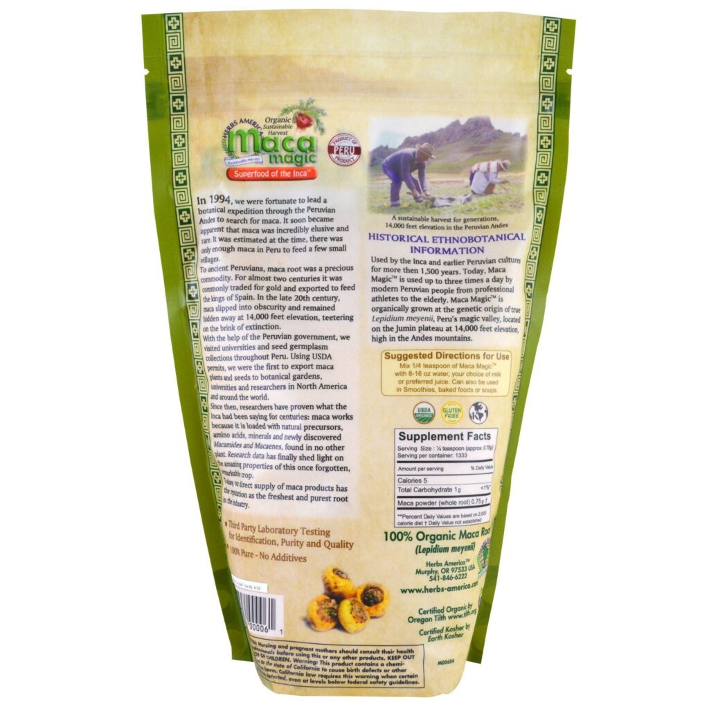 Usada pelos Incas e culturas peruanas anteriores por mais de 1.500 anos. Hoje, o Maca Magic é usado até três vezes ao dia pelos peruanos modernos, de atletas profissionais a idosos. O Maca Magic é cultivado organicamente, na origem genética do verdadeiro Lepidium meyenii, no vale mágico do Peru, localizado no planalto de Jumin, a 14.000 pés de altitude, nas montanhas dos Andes.