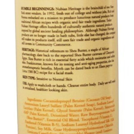 Nubian Heritage corporal de manteiga de karité é feita com ingredientes orgânicos certificados. Nubian Heritage Cru Karité Manteiga Corpo Lavar contém cura, hidratante e proteger propriedades com soja leite, Vitamina E, incenso e mirra. Nubian Heritage A lavagem corporal com manteiga de karité não é testada em animais. As Nubian Heritage Coleção de Manteiga de Karité são receitas de vitaminas essenciais, ingredientes nutritivos para a pele e cabelos, incluindo Vitaminas E e B-5, Leite de Soja, Óleo de Jojoba, Manteiga de Cacau e Óleo de Semente de Macadâmia. As fórmulas exclusivas são infundidas com uma mistura especial de óleo essencial de incenso, mirra, cardamomo, gengibre e pimenta preta que adiciona uma experiência aromática e propriedades de cura da pele. Incenso é conhecido por suas propriedades tonificantes e anti-envelhecimento e adiciona benefícios terapêuticos aroma promovendo a força mental, clareza e equilíbrio, enquanto a mirra é conhecida como um cosmético superior nos primeiros remédios e ajuda a curar a pele rachada.
