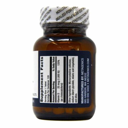 A embalagem do Metagenics D3 1,000™ contém 120 tabletes, oferecendo um suprimento prolongado para o uso contínuo.