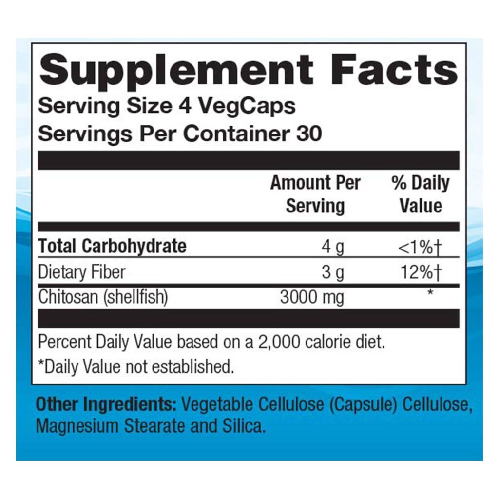 A quitosana é uma fibra natural derivada da quitina, encontrada em crustáceos. Sua principal ação no controle de peso ocorre pela capacidade de se ligar às gorduras no trato digestivo, formando um complexo que é excretado pelo corpo, reduzindo assim a absorção de lipídios e calorias.