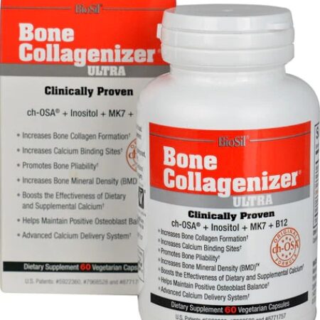 O BioSil® Bone Collagenizer® Ultra é um suplemento alimentar em cápsulas vegetarianas que contém uma combinação de vitaminas essenciais e silício estabilizado com colina (ch-OSA®), projetado para estimular a produção natural de colágeno do corpo, promovendo a saúde óssea, a elasticidade da pele e o fortalecimento de cabelos e unhas.