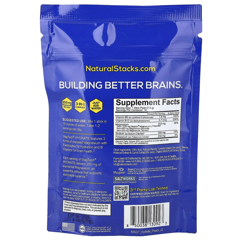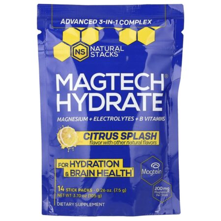 Natural Stacks Magtech® Hydrate Splash de Cítricos 14 Embalagens Stick-pack 75 g (026 oz) Cada – Natural Stacks Nutrição Esportiva Hidratação e Eletrólitos Suplementos Minerais Magnésio L-Treonato de Magnésio.