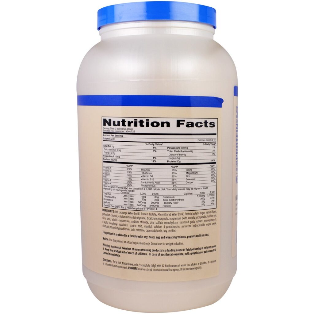 O whey protein isolado, como o Nature’s Best Isopure, passa por um processo de filtragem mais refinado que remove a maior parte da gordura e lactose, resultando em uma concentração proteica maior por porção e sendo ideal para intolerantes à lactose.