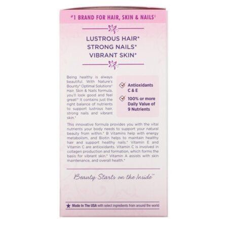 Ser saudável é sempre belo. Com a Fórmula para Cabelos, Pele e Unhas da Nature Bounty Optimal Solutions, você ficará bem e se sentirá bem! Contém o equilíbrio certo de nutrientes para apoiar cabelos brilhantes, unhas fortes e uma pele vibrante.