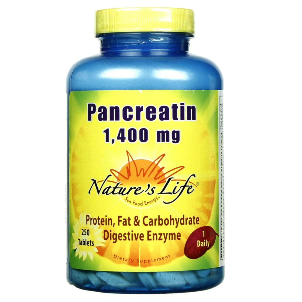 Cada tablete de Nature’s Life Pancreatina contém 1.400 mg de Pancreatina.