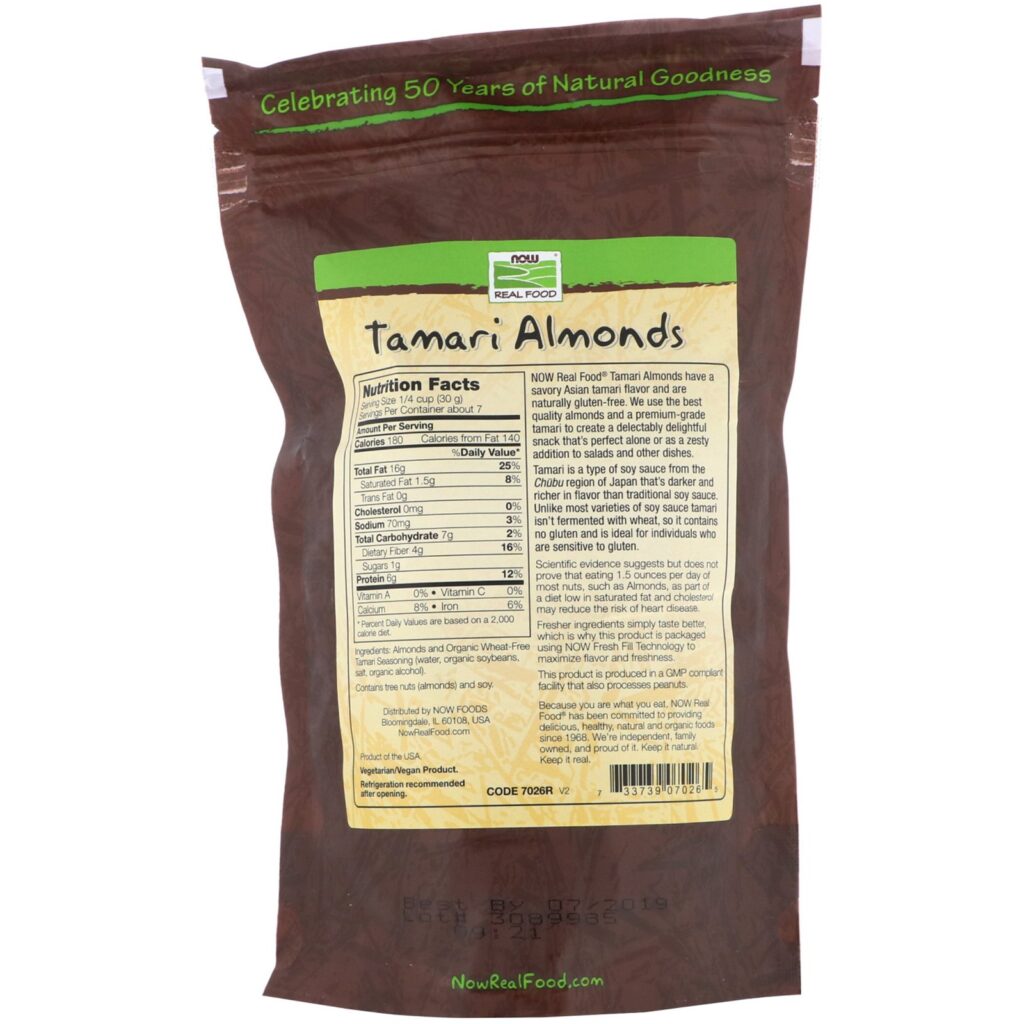 Now Real Food® Tamari Almonds have a savory Asian tamari flavor and are naturally gluten-free. We use the best quality almonds and a premium-grade tamari to create a delectably delightful snack that’s perfect alone or as a zesty addition to salads and other dishes.