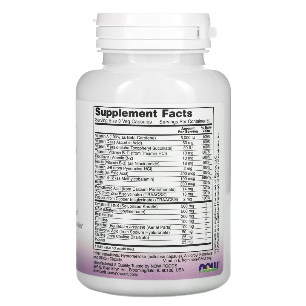 NOW® Solutions Clinically Advanced Hair, Skin & Nails é formulado para nutrir o cabelo, a pele e as unhas de dentro para fora. Este produto apresenta Cynatine® HNS, uma forma revolucionária, patenteada e biodisponível de queratina solubilizada que ajuda você a manter os cabelos com volume e brilho e as unhas fortes e flexíveis. Cynatine® HNS também pode contribuir para manter a umidade e a elasticidade joviais da pele e combater os sinais de envelhecimento associados aos radicais livres. Este produto também possui os nutrientes essenciais e necessários para o suporte e a manutenção da aparência saudável e jovial da pele.