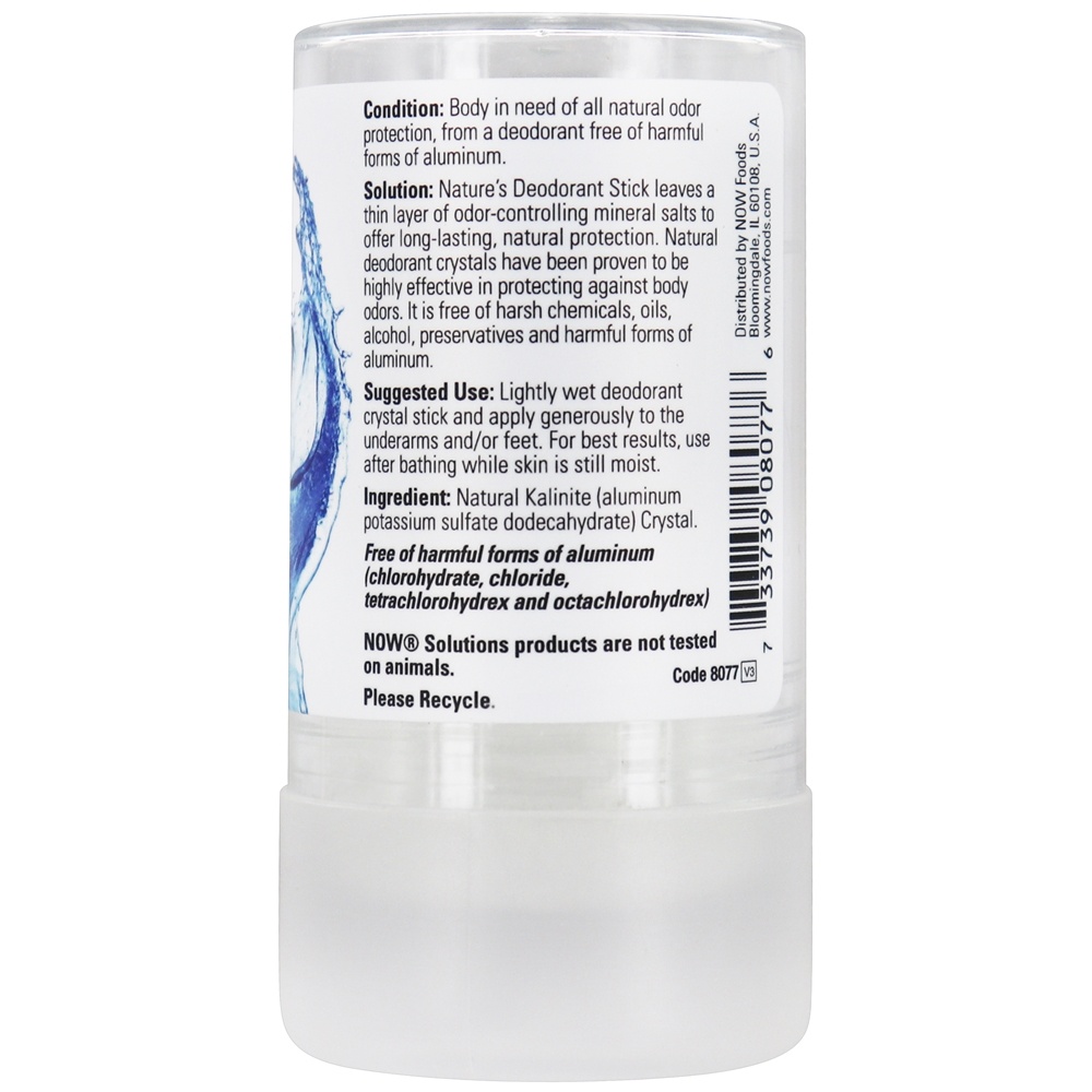 NOW Foods cristais desodorizantes em bastão têm se mostrado altamente eficazes na proteção natural contra odores corporais. Ao deixar uma fina camada de sais minerais que controlam o odor, o desodorizante em stick da NOW Solutions Nature oferece proteção de odor duradoura em que você pode confiar. O desodorizante em bastão NOW Solutions Nature é totalmente isento de produtos químicos, óleos, perfumes, álcool, conservantes e cloro-hidrato de alumínio.