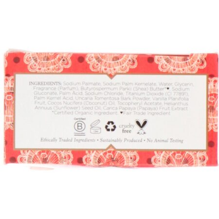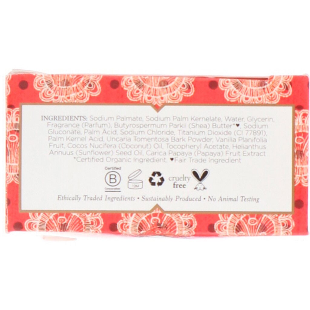 Palmato de sódio, kernelato de palma de sódio, água, glicerina, fragrância (parfum), manteiga de butyrospermum parkii (shea)*♥, gluconato de sódio, ácido de palma, cloreto de sódio, dióxido de titânio (ci 77891), ácido de palmiste, casca de uncaria tomentosa em pó, fruto de baunilha planifolia, óleo de cocos nucifera (coco), acetato de tocoferila, óleo de semente de helianthus annuus (girassol), carica papaya (mamão) extrato de frutas.