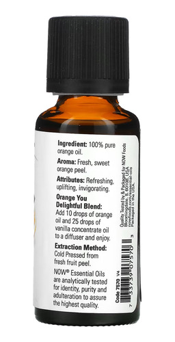 Como um produto 100% puro, o óleo de laranja Now Foods não contém OGMs, é adequado para veganos e vegetarianos e não foi testado em animais. Mantenha fora do alcance de crianças. Evite contato com os olhos. VIDE VALIDADE