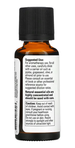 Para uso em aromaterapia. Para todos os outros usos, dilua cuidadosamente com um óleo transportador, como jojoba, semente de uva, oliva ou óleo de amêndoa antes de usar. Consulte um livro de óleos essenciais ou outra fonte de referência profissional para as taxas de diluição sugeridas;