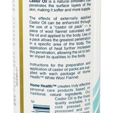 Home Health O óleo de rícino é um óleo emoliente puro, natural e prensado a frio que amacia e nutre a pele. O Óleo de Cástor é ideal para uso em mamadeiras de óleo de mamona e é excelente para massagem nas articulações e nos músculos . O óleo de mamona é um emoliente natural que penetra nas camadas superficiais da pele, tornando-a mais macia e flexível. Os efeitos do óleo de rícino aplicado externamente podem ser melhorados através do uso de um pacote de óleo de mamona – um pedaço de flanela de lã saturada com o óleo e aplicada ao corpo. O uso de um pacote permite a maior penetração em uma área específica do corpo. A aplicação de calor aumenta ainda mais essa penetração, permitindo que o óleo transmita melhor suas qualidades naturais ao corpo. As instruções para a preparação e aplicação dos maços de mamona são fornecidas com cada pacote de Home Health Flanela de lã branca. O óleo de rícino de Home Health é a melhor qualidade disponível. O óleo de mamona pode ser útil como amaciador de pele, para tratar problemas gastrointestinais, lacerações, desordens da pele e para aliviar a dor e a rigidez associadas à artrite e ao reumatismo.