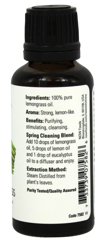 NOW Foods 100 % Pure Óleo Essencial de Lemongrass é para uso em aromaterapia. Contém Cymbopogon flexuosus, que oferece um forte aroma a limão. Ele fornece benefícios purificadores, estimulantes e de limpeza. Este óleo essencial é extraído por destilação a vapor das folhas da planta.