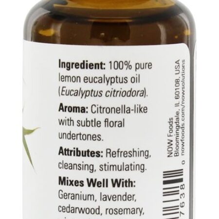 NOW Foods O Óleo Essencial de Eucalipto de Limão é um eucalipto de limão 100 % puro Eucalyptus citriodora e vapor destilado de folhas e galhos. NOW Foods O óleo essencial de limão eucalipto tem um aroma de citronela com subtis tons florais. NOW Foods O Óleo Essencial de Eucalipto Limão tem atributos refrescantes, purificadores e estimulantes, além de se misturar bem a óleos de gerânio, lavanda, cedro, alecrim, hortelã e árvores.