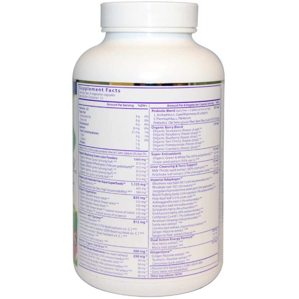 A fórmula inclui uma combinação sinérgica de folhas verdes como espinafre, couve, brócolis, e gramíneas como cevada e alfafa, além de outros extratos vegetais ricos em antioxidantes e nutrientes essenciais.