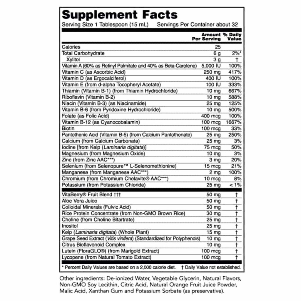 A fórmula do OrthoLiquid™ é abrangente e inclui diversas vitaminas (como A, C, D, E, K, complexo B) e minerais (como Zinco, Selênio, Magnésio, etc.), cada um com funções vitais. Por exemplo, a Vitamina C e o Zinco auxiliam o sistema imunológico, as Vitaminas do Complexo B são cruciais para o metabolismo energético e a função nervosa, e a Vitamina D e o Cálcio são essenciais para a saúde óssea. A sinergia entre esses componentes é fundamental para o efeito completo do multivitamínico.