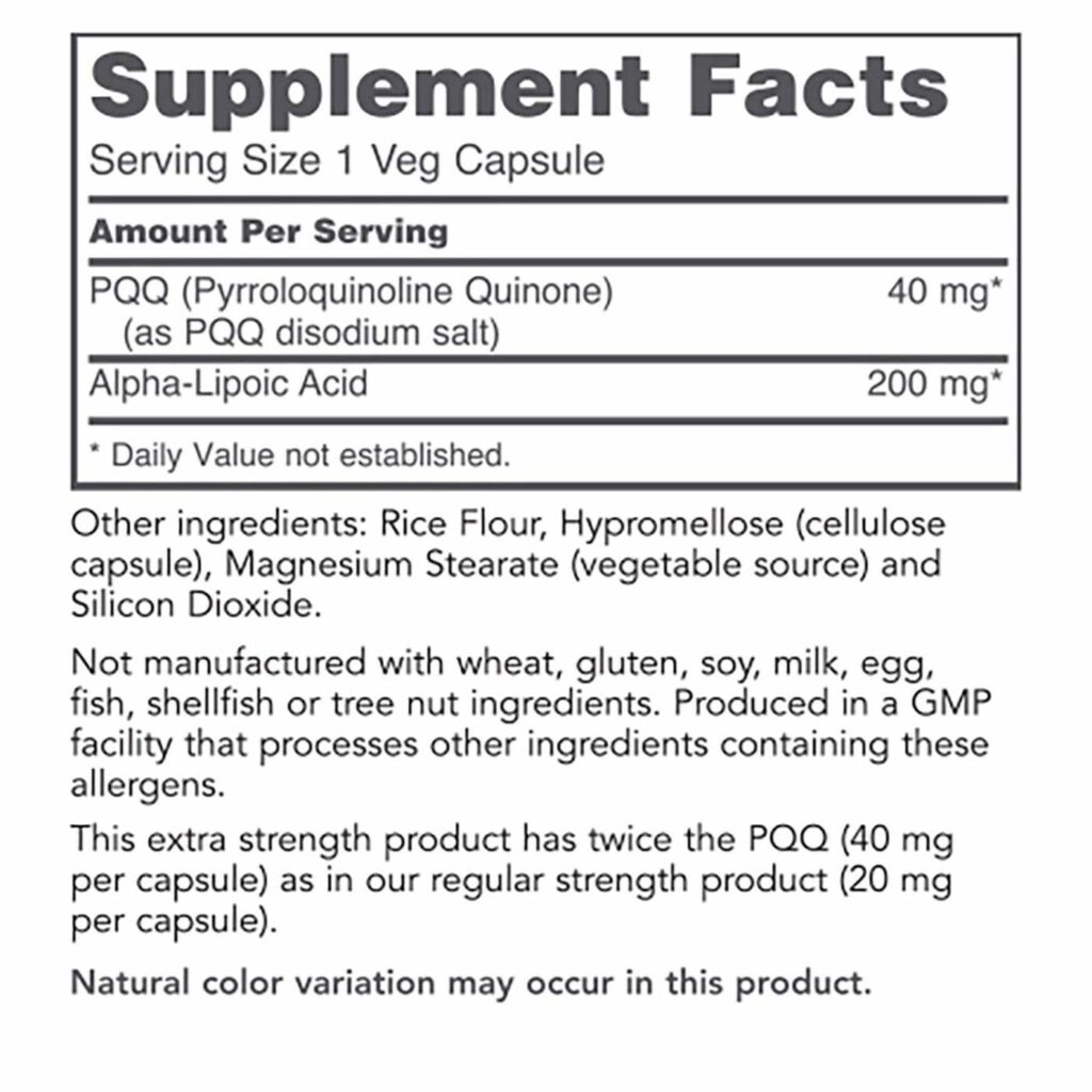 Cada cápsula contém 40 mg de PQQ de alta potência.
