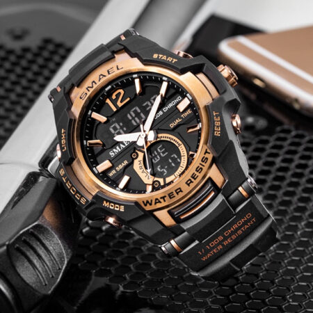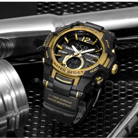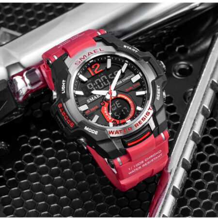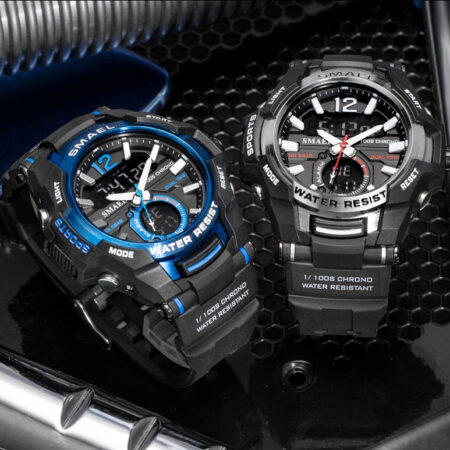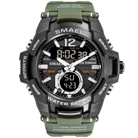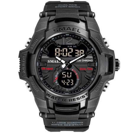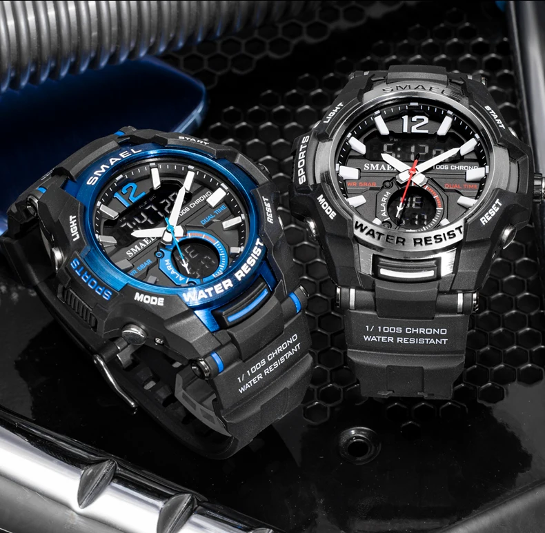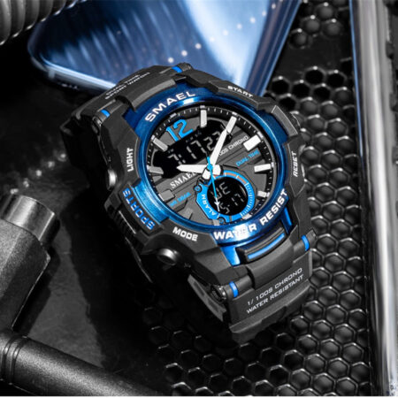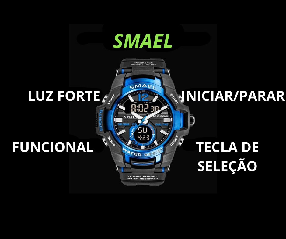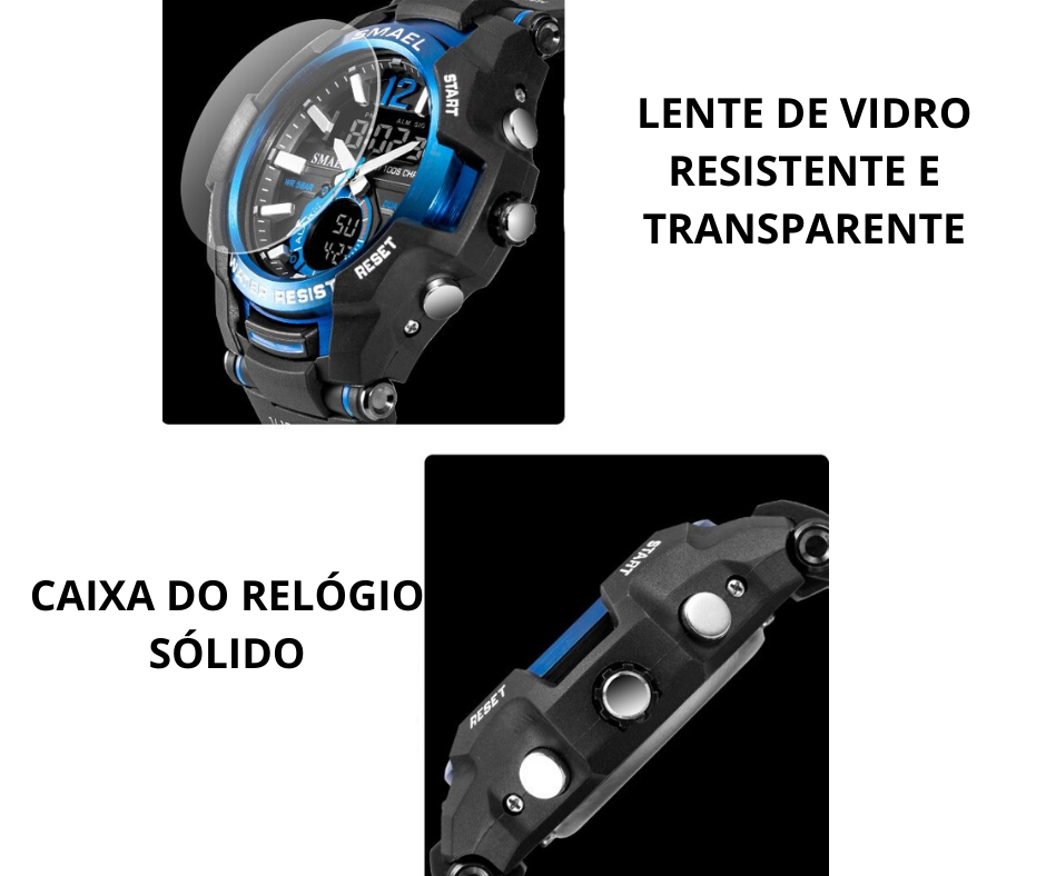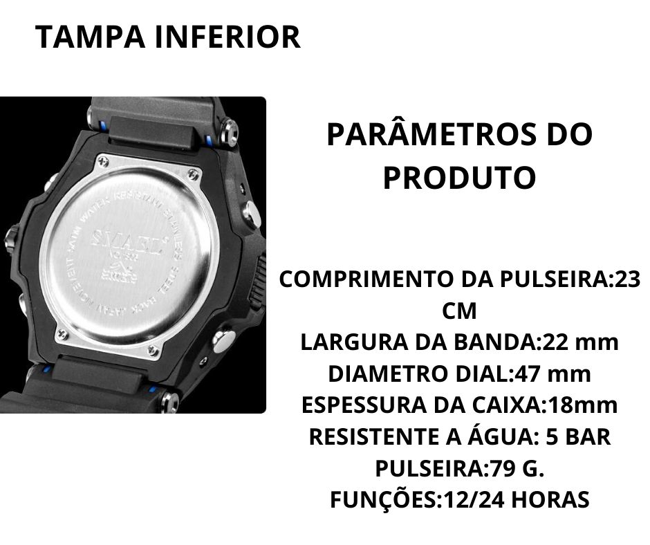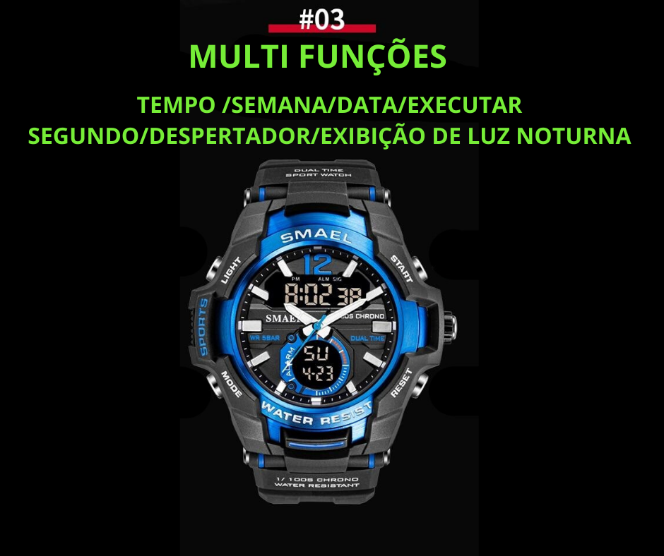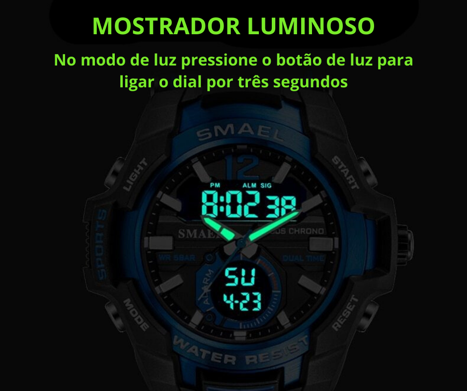 Com DISPLAY LUMINOSO e luz negra que brilha à noite, você vai conseguir ver a hora mesmo quando estiver escuro. Ele marca a data, semana, possui cronômetro, alarme, calendário completo, múltiplos fusos horários, LED de exibição e resistente a choques.