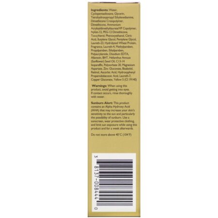 Água, ciclopentasiloxano, glicerina, tetrahidroxipropil etilenodiamina, polímero cruzado de dimeticona, dimeticona, copolímero de acrilidimetiltaurato / VP de amônio, nylon-12, dimeticona de PEG-12, tocoferol, fenoxietanol, ácido cítrico, butilenoglicol, pentilenoglicol, laureth-23, proteína de trigo hidrolisada, fragrância, laureth-4, metilparabeno, propilparabeno, etilparabeno, poliacrilamida, EDTA dissódico, alantoína, BHT, óleo de semente de helianthus annuus (girassol), isoparafina C13-14, polissorbato 20, aspartato de magnésio, gluconato de zinco, bisabolol, retinol, ácido ascórbico, ácido hidroxifenil propamidobenzóico, laureth-7, gluconato de cobre, amarelo 5 (Cl 19140)