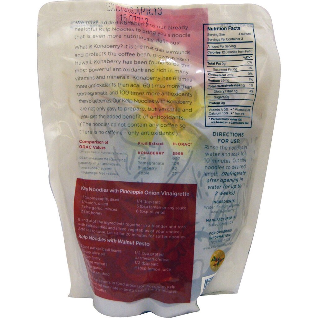 What is Konaberry? It is the fruit that surrounds and protects the coffee bean, grown in Kona, Hawaii. Konaberry has been found to be the most powerful antioxidant and rich in many vitamins and minerals. Konaberry has 6 times more antioxidants than acai, 60 times more than pomegranate, and 100 times more antioxidants then blueberries. Our Kelp Noodles with Konaberry are not only easy to prepare, but versatile and you get the added benefit of antioxidants. (The noodles do not contain any coffee so there is no caffeine- only antioxidants!)