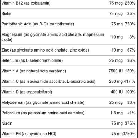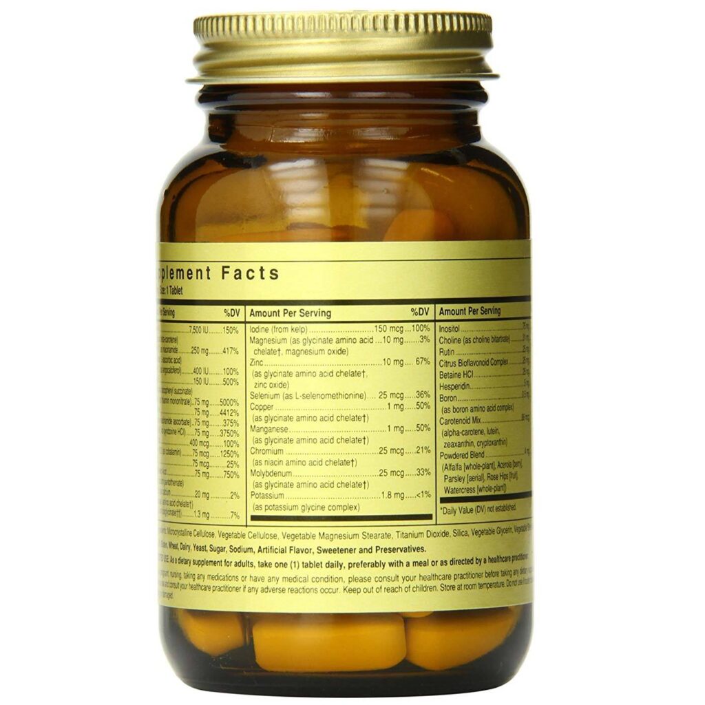O Solgar Fórmula VM-75 contém uma combinação abrangente de vitaminas como C, D, E, complexo B, além de minerais como cálcio, ferro, magnésio, zinco, e outros nutrientes como colina e inositol.